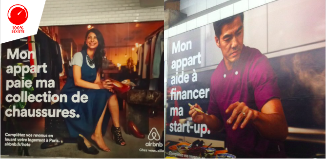 Voici une publicité Airbnb avec un parallèle entre une femme et un homme. La location d’appartement paie la collection de chaussures de la femme alors qu’elle aide à financer la start-up du monsieur. Comme si un homme n’était pas attiré par les chaussures ou qu’une femme ne pouvait pas être entrepreneuse.
