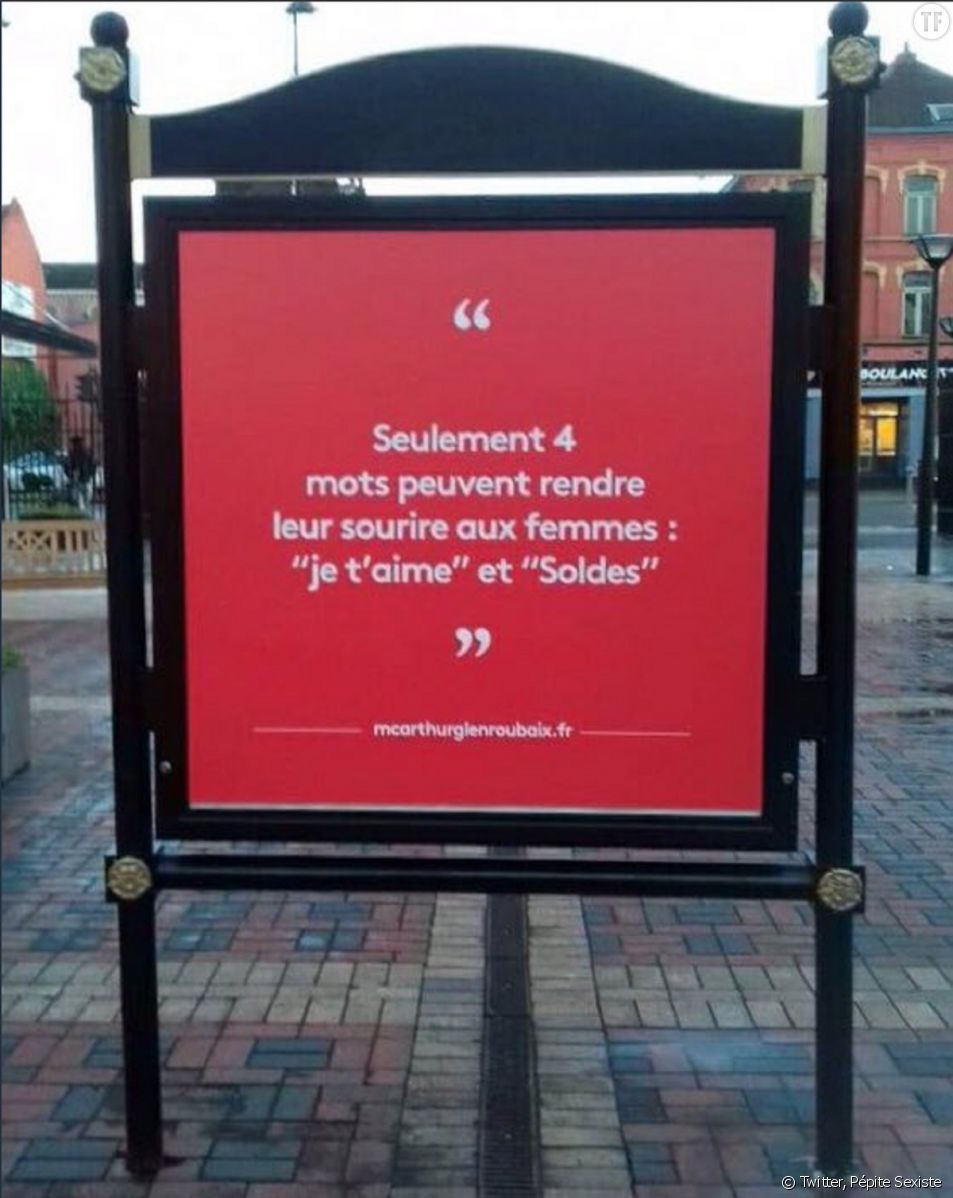 Regardons aussi cette publicité pour un grand centre commercial de Roubaix avec la mention : « Seuls 4 mots peuvent rendre leur sourire aux femmes : « Je t’aime » et « Soldes ».