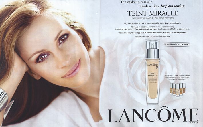 - 2 : lorsque la marque choisit des mannequins ou actrices d’un âge un peu plus avancé, qui correspond donc mieux à la cible du produit, elles sont excessivement retouchées. Voici un exemple d’une pub avec Julia Roberts pour un fond de teint miracle, qui ont été interdites de diffusion en Angleterre qui a jugé le visage de l’actrice trop retouché.